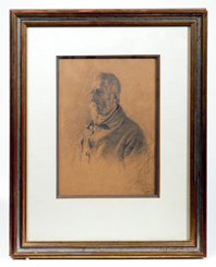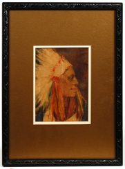 Joseph Henry Sharp (Cincinnati, Ohio, 1859-1953) 10" x 8" pencil drawing on paper of a portrait of a veteran. Signed lower right "J.H. Sharp" and dated "Nov.-82". Sharp was born in Bridgeport, OH. on Sept. 27, 1859. He was a painter illustrator and teacher whose love affair with the American Southwest and its native people was vividly expressed in his art. Sharp's love and talent of painting Native American Indians has led him to be one of America's premier artists. His works can be found in museums throughout the country. Fine condition. EST. $1000. - $2500. SOLD $1,870 |