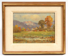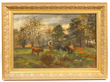 Charles Alfred Meurer (Terrace Park, Cincinnati, Ohio, 1865-1955) 12" x 18" oil on canvas of cattle grazing beside home. Signed lower right "C.A. Meurer". Meurer studied with Duveneck, Noble and Meakin at the Cincinnati Art Academy and in Paris with Laurens, Constant, Ferrier and Doucet. He was a member and on the board of directors of the Cincinnati Art Club. He maintained a studio in Terrace Park for many years. Well listed artist. Stretched on new stretcher, fine condition. EST. $600. - $1200. SOLD $770 |