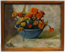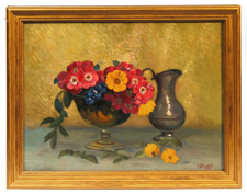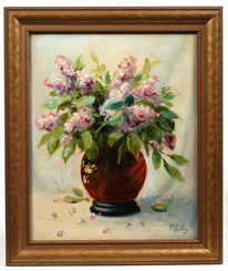 Charles Alfred Meurer (Terrace Park, Cincinnati, Ohio, 1865-1955) 14" x 18" oil on canvas still life painting. Signed lower right "C.A. Meurer" and dated "1928". Meurer studied with Duveneck, Noble and Meakin at the Cincinnati Art Academy and in Paris with Laurens, Constant, Ferrier and Doucet. He was a member and on the board of directors of the Cincinnati Art Club. He maintained a studio in Terrace Park for many years. Well listed artist. Stretched on new stretcher, fine condition. EST. $500. - $1000. SOLD $385 |