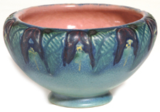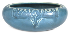 Great Arts & Crafts design with carved leaves and drip decoration. Dated 1916. Shape #1877. Artist's initials inscribed. Fine condition. 3 1/4" h x 5 1/4" d. EST. $400. - $600. SOLD $440 |