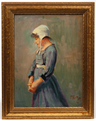 Martin Rettig (Cincinnati, Ohio, 1869-1956) 12" x 9" oil on board portrait painting. Signed lower right "M. Rettig" and dated "91". Martin Rettig studied with Frank Duveneck at the Cincinnati Art Academy. He was president of the Cincinnati Art Club from 1918-1920. He was a charter member and first president of the Connate Art Club. In 1883, he joined the staff of Rookwood Pottery. Well listed artist. Fine condition. EST. $300. - $600. SOLD $330 |