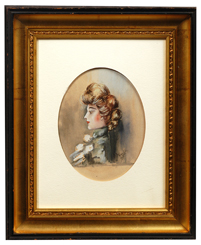 Mary Louise McLaughlin (Cincinnati, Ohio, 1847-1939) 5 1/2" x 4 1/2" portrait watercolor on paper. Signed lower right "M. McLaughlin" and dated "1909". Mary McLaughlin studied with Duveneck at the Cincinnati Art Academy. In 1879, she founded the Cincinnati Pottery Club, the first women's pottery club in America. Well listed artist. Fine condition. EST. $200. - $400. SOLD $121 |