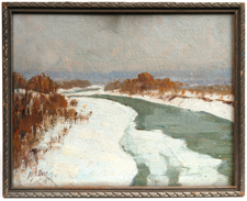 Matt A. Daly (Cincinnati, Ohio, 1859-1937) 9" x 12" oil on board of a winter landscape painting with stream. Signed lower left "M.A. Daly" and dated "1926". Matt Daly was born in Mt. Adams. He studied with Duveneck, Noble and Lutz. He was a member of the Cincinnati Art Club, A.A. Professional League and McMicken School of Design. Matt Daly was one of the premier artist at Rookwood Pottery. Well listed artist. Fine condition. EST. $400. - $600. SOLD $495 |