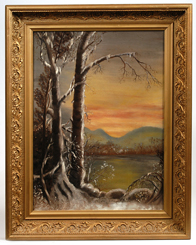 Thomas Corwin Lindsay (Cincinnati, Ohio, 1845-1907) 22" x 16" winter landscape painting. Monogrammed left "T.C.L.". Thomas Lindsay, born in Cincinnati, Ohio, was a well known painter of landscapes, portraits and animals. He was a founding member of the Cincinnati Art Club. He exhibited at the Cincinnati Industrial Exposition, Pogues, etc. His works are in the collection of the Cincinnati Art Museum. Well listed artist. Relined. Fine condition. EST. $400. - $800. SOLD $440 |