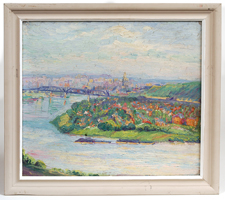 Ida Barbour Carmichael (Cincinnati, Ohio, 1881-1981) 14" x 16" oil on board titled "Overlook" of Cincinnati. Signed lower right "Ida Carmichael". This painting is from the Ida Carmichael Estate, accompanied with a letter from family. Ida Carmichael graduated from the New England Conservatory of Music, Boston in 1904. She received a masters degree from the University of Cincinnati and Doctors of Education from the University of Oregon in 1945. She studied at the Cincinnati Art Academy with Reginald Grooms, Clement Barnhorn and Herman Wessel. Her work has been exhibited at the Cincinnati Art Museum, Closson's Galleries, Butler Art Institute, Ohio Valley Art & Watercolor Show, Loring Andrews Galleries, etc. She taught at the Walnut Hills High School from 1930 to 1951. Dr. Carmichael was a member of the Women's Art Club of Cincinnati, the National Society of Modern Art and the Ceramic Guild of Cincinnati, as well as various other local and national associations. Fine condition. EST. $300. - $600. SOLD $660 |
