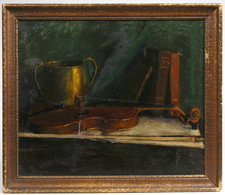 Fine 20" x 24" oil on unstretched canvas still life painting with violin. Unsigned. Old repair, otherwise good condition. EST. $100; - $200. SOLD $88 |