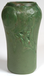 Green over brown mat glaze with large carved flowers. Dated 1906. Shape #935C. Artist's initials are incised. X'd for glaze imperfections. Professional repair to rim. 8 7/8" h. EST. $200. - $400. SOLD $220 |