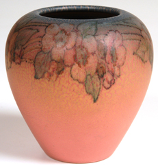 Lovely floral decoration over pink mat glaze. Dated 1929. Shape #1120. Artist's initials are in black slip. Fine condition. 5 1/4". EST. $400. - $600. SOLD $605 |