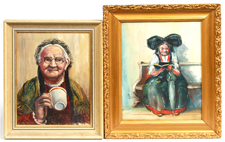 One 20th Century 11 1/2" x 9" oil on board of seated lady. Signed lower left "P. Binder". Plus one 11" x 8" 20th Century oil on board of lady with cup. Signed lower left "P. Binder". Both in fine condition. EST. $100. - $200. SOLD $33 |