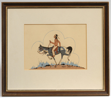 Robert (Hashke-Yil-Cale) Chee (Arizona, 1930-1972) 6" x 8" gouache on paper of an Indian rider. Signed lower right "Robert Chee". Robert Chee was born in St. Michaels, Arizona. He attended school at Intermountain Indian School, where he studied art under Allen Hauser, Apache, for two years. He served in the Army overseas, where the officers arranged for him to paint murals on the walls of buildings. He won several prizes at the Navajo Tribal Fair's in 1959 and 1960. Well listed artist. Fine condition. EST. $150. - $350. SOLD $192.50 |