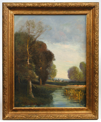 A fine 20" x 16" oil on canvas landscape painting. Signed lower left with illegible signature. Fine condition. EST. $50. - $150. SOLD $88 |