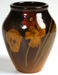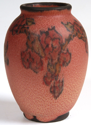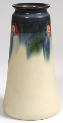 Floral decorated vase with rich colors. Dated 1922. Shape #2191. Artist's initials in black slip. Glaze imperfections near base. 5 1/4" h. EST. $300. - $500. SOLD $330 |