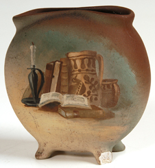 Pillow form footed vase with handpainted still life. Dated 1902. Shape #900. Artist's initials are incised. Chip to one foot. 4" x 4". EST. $150. - $300. SOLD $357.50 |