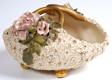 Light brown over pink with molded flowers and footed base. Dated 1922. Shape #1630. Fine condition. 10" h. EST. $200. - $400. SOLD $302.50 |