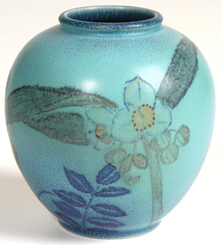 Rookwood decorated mat vase by Kataro Shirayamadani and Louise Abel. Wonderful floral decoration on turquoise background. Dated 1932. Shape #6204. Artist's signature incised in blue slip. Very minute professional repair to lip. 4 3/4" h. EST. $400. - $700. SOLD $715 |