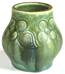 Carved flowers and blue-green drip glaze. Dated 1914. Shape #1064. Artist's initials incised. Fine condition. 3 3/4" h. EST. $300. - $500. SOLD $357.50 |