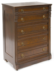 Five drawers with burl fronts. Original finish and hardware. Split to top, otherwise very good condition. 46" h x 31 3/4" x 19" d. EST. $500. - $800. SOLD $440 |