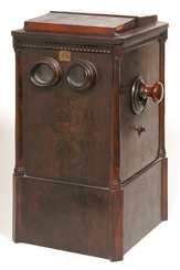 Ca. 1860. Rosewood "Sweetheart" viewer with lenses on each side. Veneer chips to top lids, otherwise very good with original finish. Holds 140 cards. 19" h x 9 1/2" w x 11" d. EST. $500. - $1000. SOLD $825 |