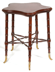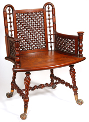 With wooden interwoven back and sides with stick and ball work and rope twist legs with brass claw and ball feet. Fine original cherry finish. Fine condition. 35" h x 27" w x 21" d. EST. $300. - $600. SOLD $3.575 |