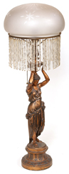 Original Ca. 1910 lamp of bronzed spelter with cut frosted shade and several prisms. 33" h. EST. $300. - $600. SOLD $522.50 |