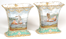 Wonderful pair of vases with handpainted scenes of cupid driving sailboat with lovers in the back. Handpainted roses on side and back panels and great gold enameling. Signed "Nast A Paris" on bases. Both excellent condition. EST. $400. - $800. SOLD $1,100 |