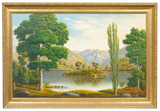 Well done oil on canvas with large trees and mountains in background. Signed lower right and dated "1956". Excellent condition. 24" x 39". EST. $150. - $350. SOLD $82.50 |
