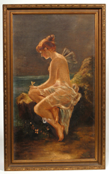 30" x 17" oil on canvas of a semi-nude fairy. Puncture at leg, otherwise good condition. EST. $75. - $150. SOLD $302.50 |
