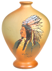 Vase has name of chief on front "White Tail". Marked "Dickensware Weller" on base. 6 1/2" h. EST. $300. - $500. SOLD $577.50 |